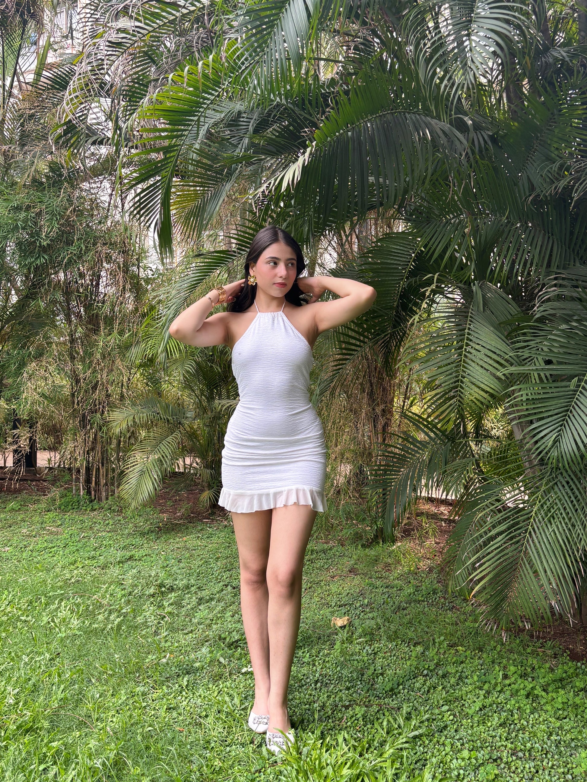Delicate, dreamy, and designed to flatter — The Pearl Dress is your go-to for daytime charm and evening elegance. Crafted from airy crushed cotton, this dress hugs the body gently while letting your skin breathe. The halter neckline adds a graceful touch, and the adjustable tie-back closure ensures a perfect fit every time. A subtle frill hemline brings playful femininity to this minimal silhouette.