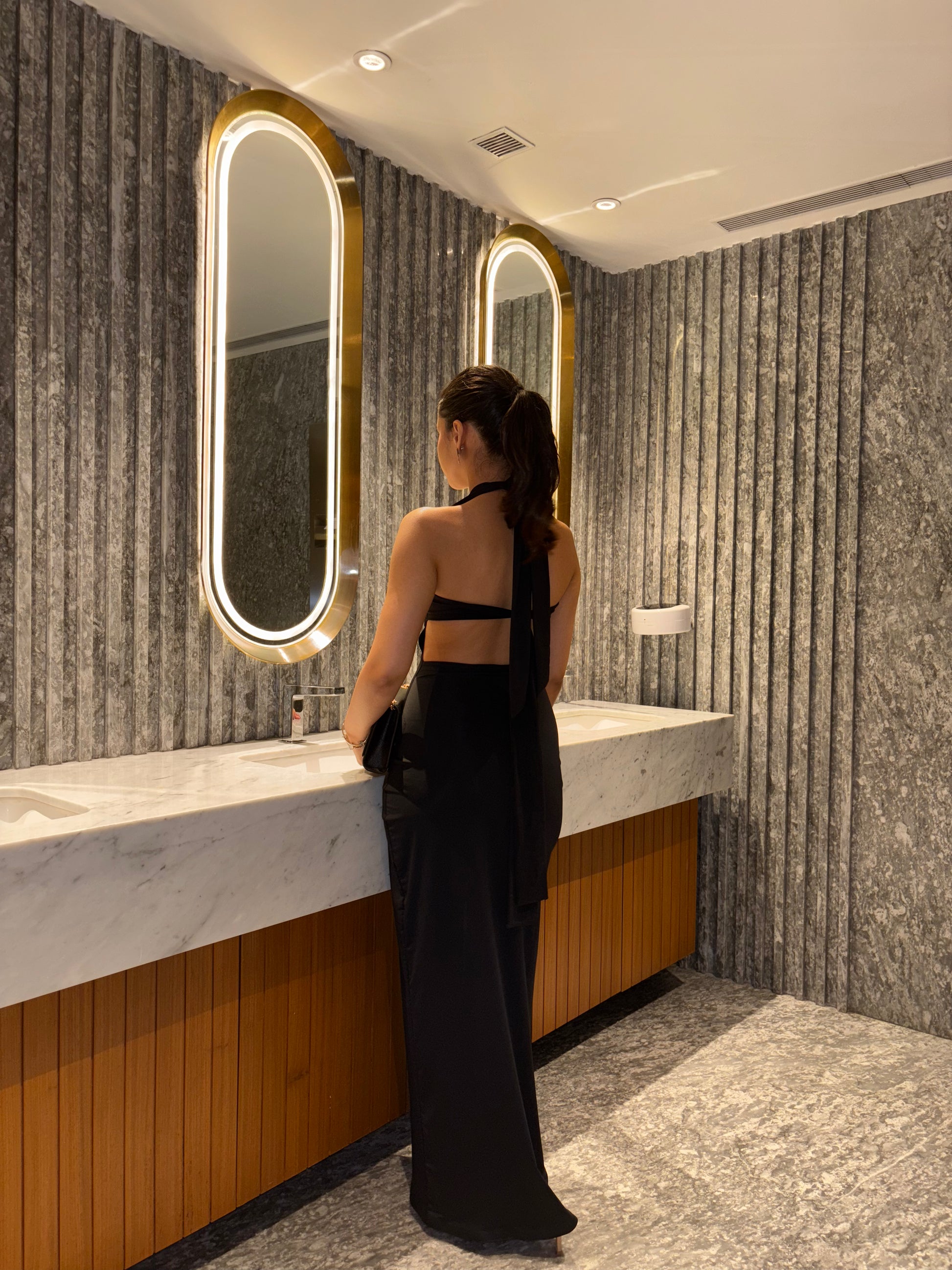 The halter neckline with a deep plunge creates a striking silhouette, while the open-back tie detail adds just the right touch of drama. Its floor-length design makes it perfect for cocktail nights, luxury dinners, or any special occasion where you want to make a lasting impression.