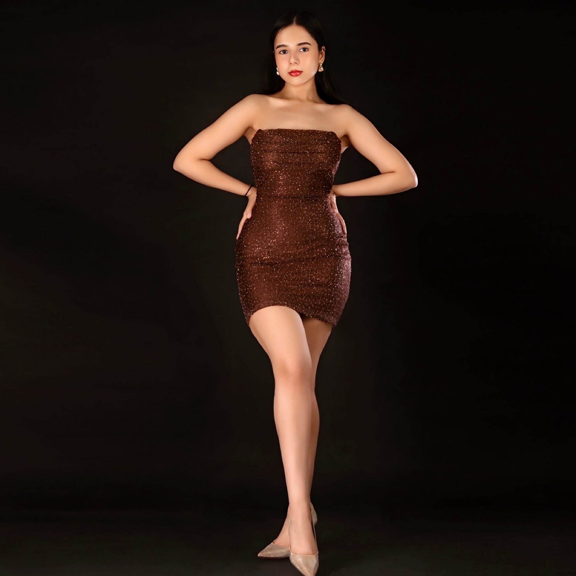 Meet Tori your go to glam dress for nights that deserve a little sparkle. Crafted in a rich embellished net fabric, this mini hugs your curves in all the right places while shimmering beautifully with every move. Elegant, minimal, and effortlessly statement-making.