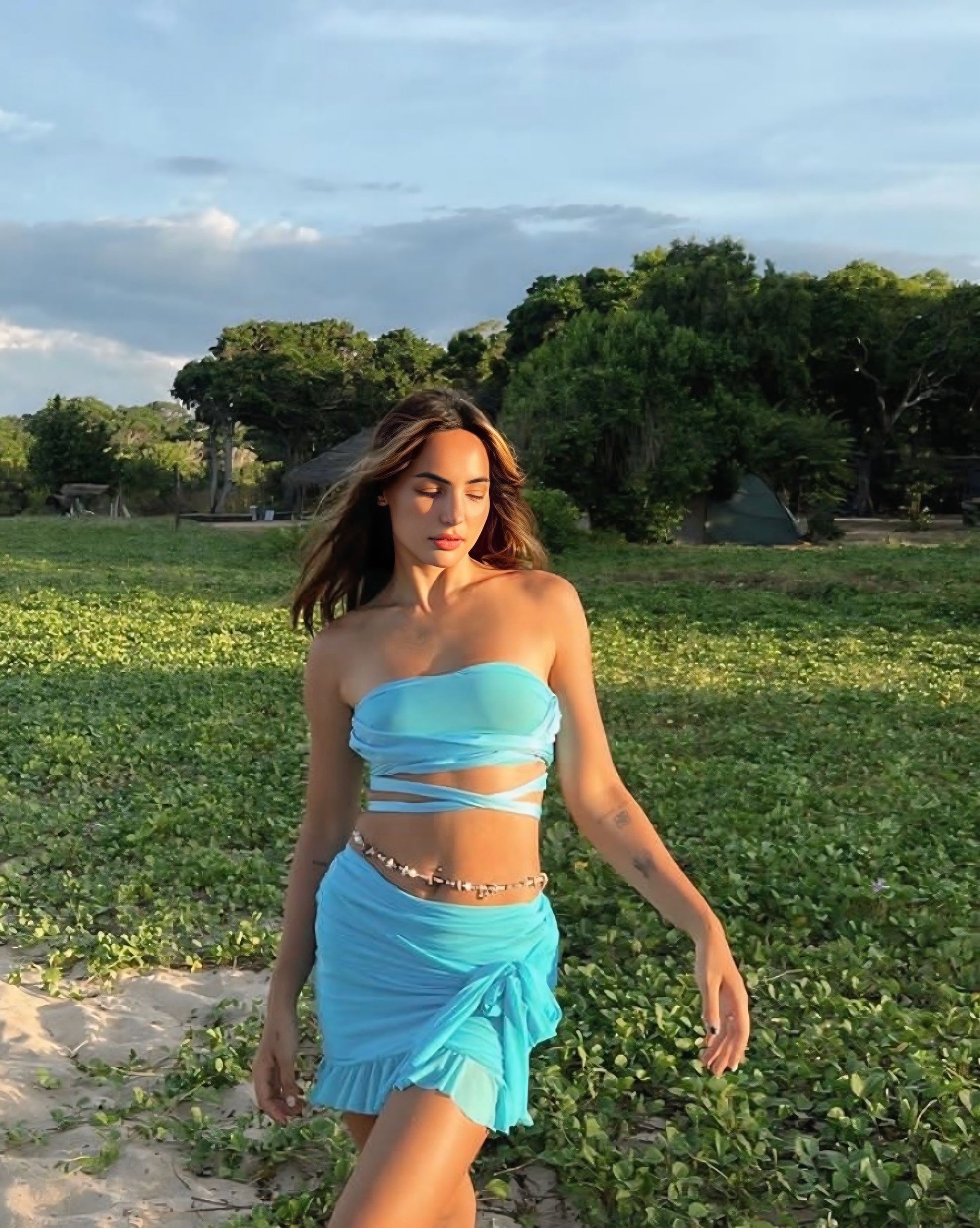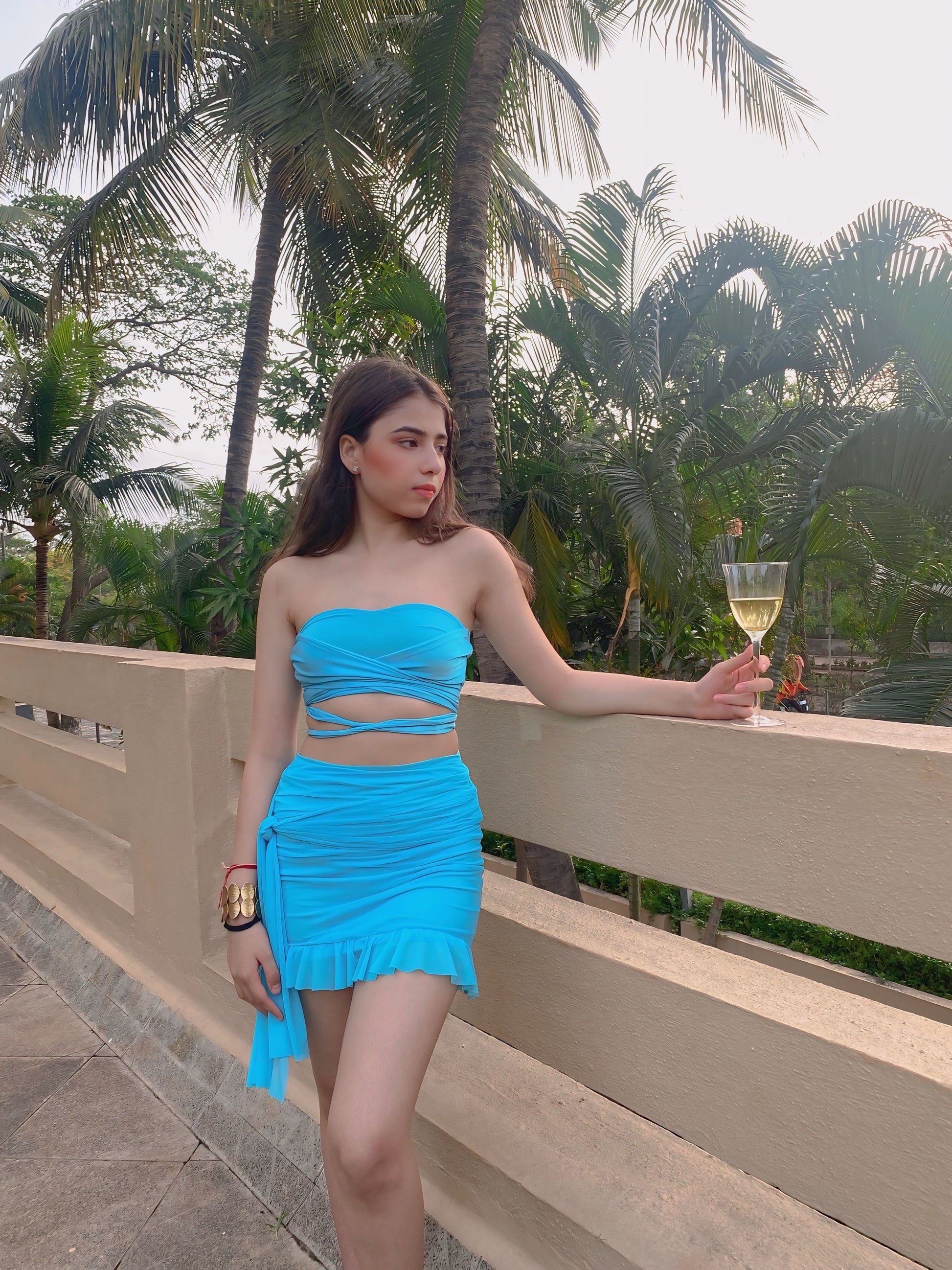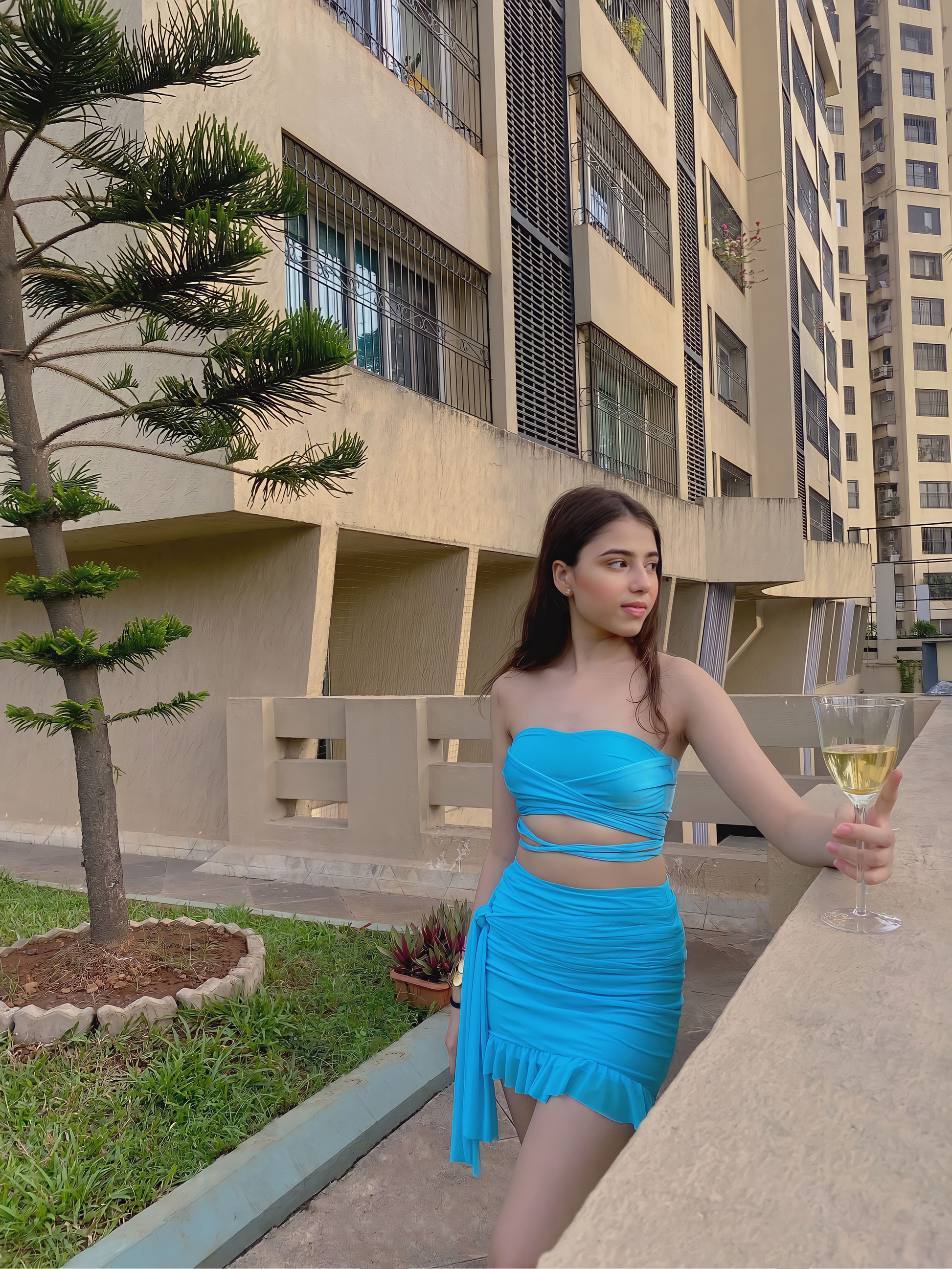 Make a statement in the True Set, the ultimate blend of chic sophistication and playful femininity. Featuring a strapless wrap crop top with tie-up detailing and a matching high-waisted mini skirt, this set is designed to hug your curves and give you a flattering silhouette. The skirt’s ruched sides and ruffled hem bring a touch of whimsy, while the bold blue color keeps it fresh and vibrant for every occasion.